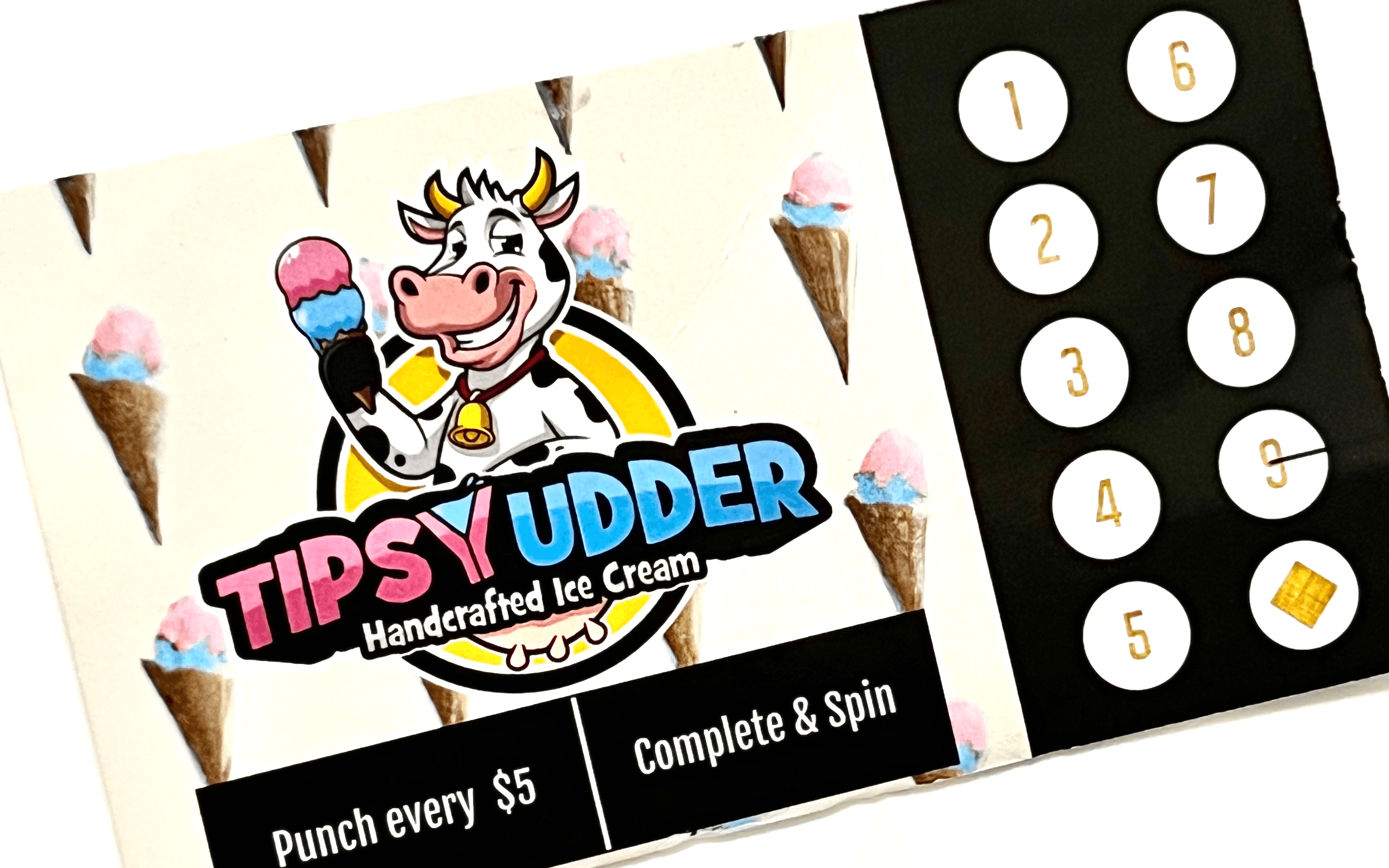 The Tipsy Udder Royalty Card is a rewards program offered to customers of our ice cream shop in Bonita Springs, Florida. For every $5 spent on ice cream, a hole will be punched in the card. Once the card is fully punched, customers will have one chance to spin the prize wheel for a chance to win a prize. Please note that the customer will only be eligible to win one prize per card. The one-month supply of ice cream is limited to one small cone or cup per day, starting from the day of the prize redemption and expires 30 days later. Waffle cones alcohol infused ice creams are not included in this prize. Other prizes may include a single free small ice cream cone or cup. The Tipsy Udder reserves the right to modify or discontinue the program at any time.